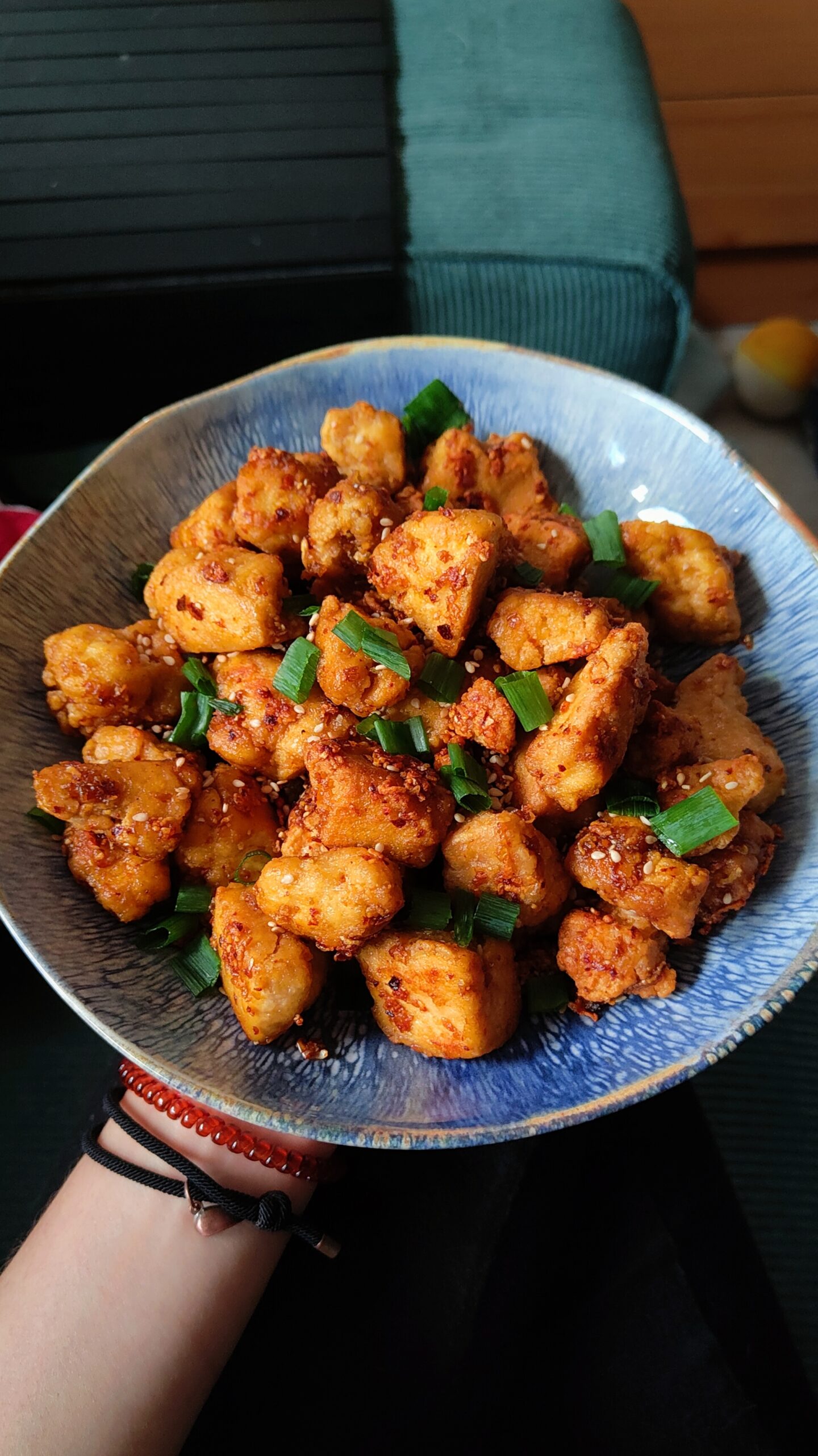 En la misma sartén, retira el exceso de aceite y sofríe el ajo rallado. Añade los copos de chili y, cuando el ajo empiece a dorarse, incorpora de nuevo el tofu y mezcla bien para que se impregne de todo el sabor. Termina con cebolleta fresca picada y semillas de sésamo por encima.
