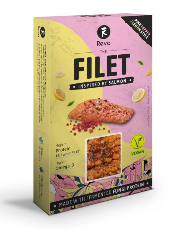 Ingredientes Micoproteína (32,8%) Fusarium venenatum sp., extruido de proteína de soja (agua, concentrado de proteína de soja), agua, aceite de canola, marinado (grasas vegetales (colza, sal), especias, sal de mesa no yodada, extracto de pimentón, aroma), proteína de colza, proteína de patata, aromas, gelificantes: metilcelulosa, carragenano; sal marina, aceite rico en DHA y EPA de microalgas Schizochytrium sp., espesante: konjac; vitaminas (vitamina B6, ácido fólico, vitamina B12), acidulante: ácido cítrico; colorante: betacaroteno.