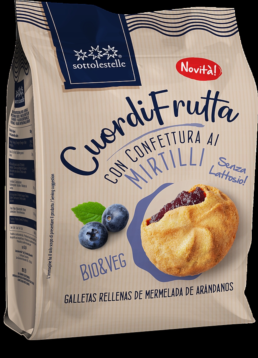 La CuordiCrema rellena de mermelada de arándanos, sin leche ni huevos, ofrece una experiencia de degustación única. El envolvente dulzor de la mermelada se fusiona con la suave consistencia de la galleta, satisfaciendo incluso los paladares más exigentes. Perfecto para quienes siguen una dieta vegana o tienen intolerancias alimentarias, una explosión de sabor sin concesiones.