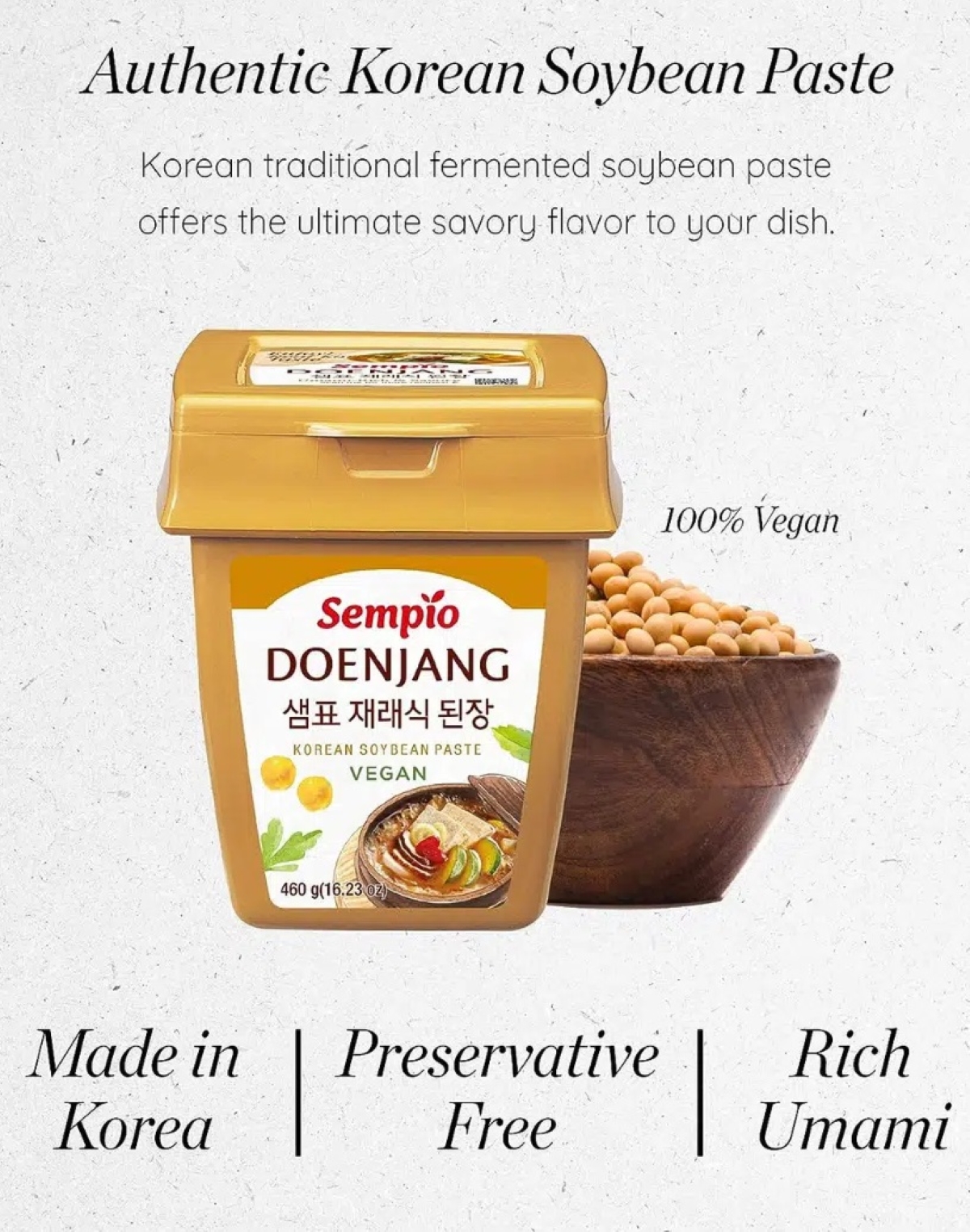 Pasta de soja coreana: un ingrediente característico en la pasta de soja fermentada tradicional de la cocina coreana rica en umami con un carácter mucho más profundo y robusto en comparación con el miso. Se utiliza tradicionalmente para sopas, guisos o como ingrediente para salsa BBQ.