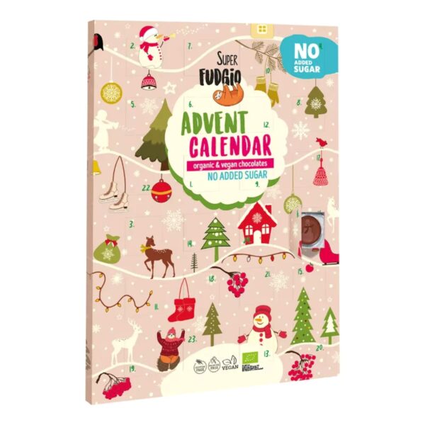 SuperFudgio Advent Calendar es un calendario de adviento relleno de chocolates únicos. Además es apto para veganos, sin azúcar añadido, endulzado con eritritol y elaborado con productos orgánicos. Sin gluten y sin aceite de palma.