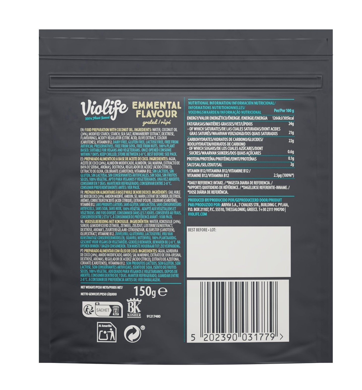 El Queso vegano Rallado sabor Emmental de Violife es un preparado alimenticio vegano elaborado a base de aceite de coco , diseñado para ofrecer una alternativa deliciosa y saludable a los quesos tradicionales. Su sabor cremoso y ligeramente afrutado, junto con su color amarillo pálido y textura firme, lo convierten en un producto versátil y fácil de usar en múltiples recetas.